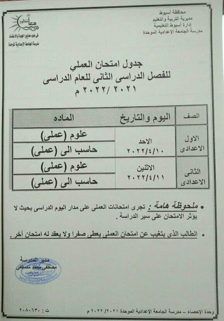موعد امتحانات العملى اولى وتانية اعدادى ترم تانى محافظة اسيوط